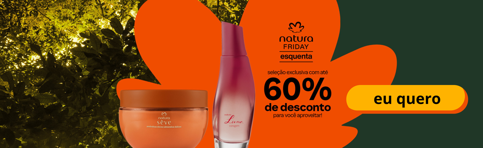 A Black Friday da Natura já começou com o Esquenta oficial, trazendo descontos de até 60% em uma seleção especial de produtos. Essa é a oportunidade perfeita para comprar perfumes, skincare, maquiagem, presentes e itens de autocuidado com preço reduzido antes do pico das promoções.