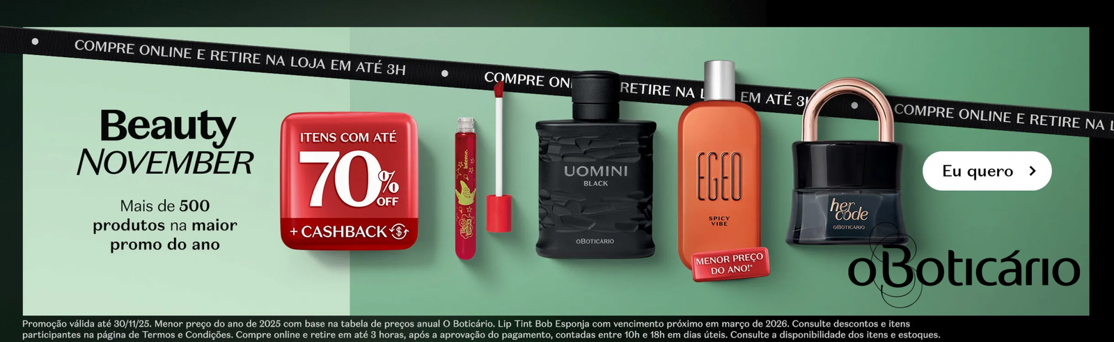 Promoção válida por tempo limitado, ideal para quem quer renovar o estoque de perfumes, skincare, maquiagem e cuidados diários. Aproveite agora e garanta o melhor da Black November Natura.